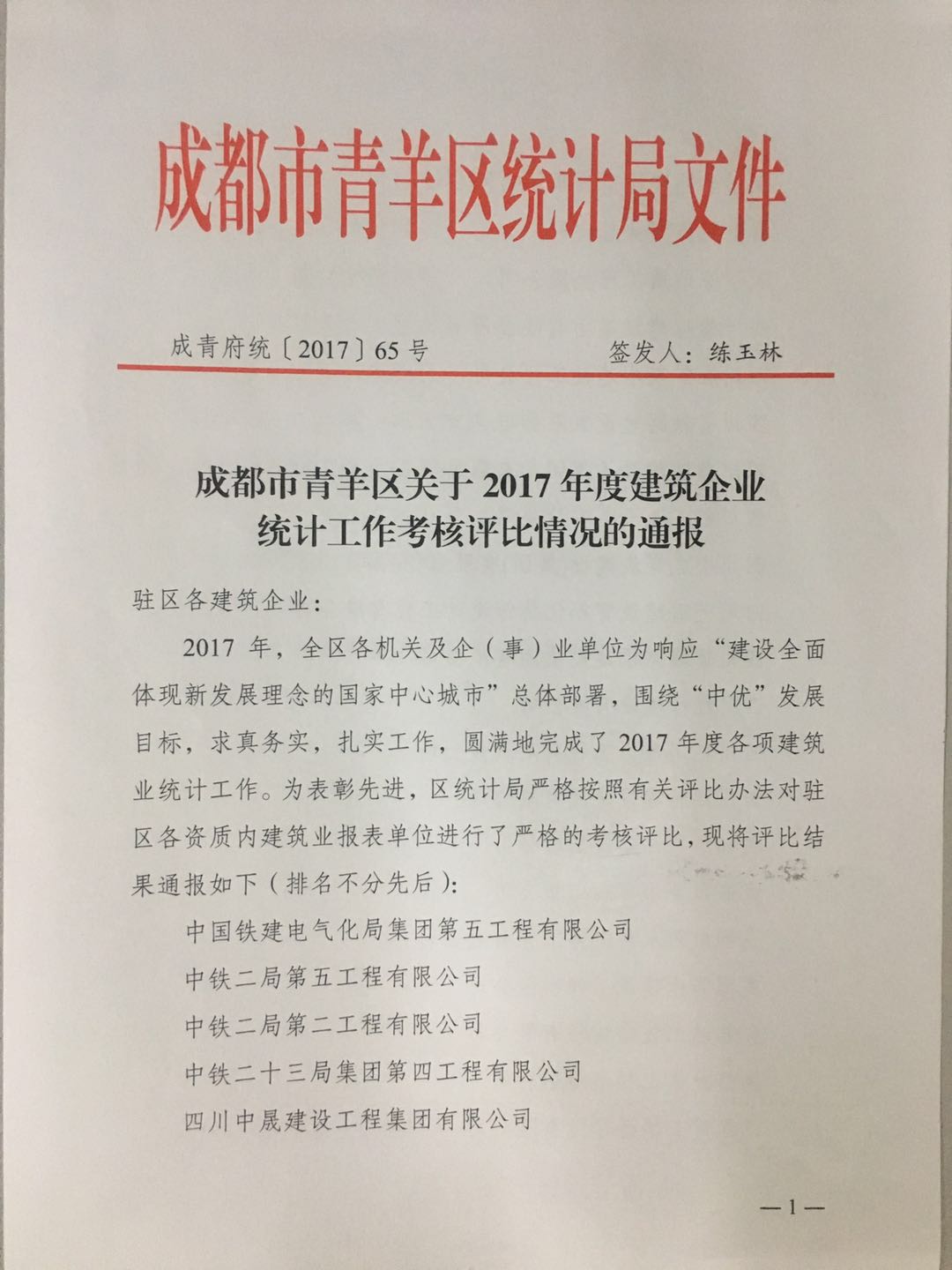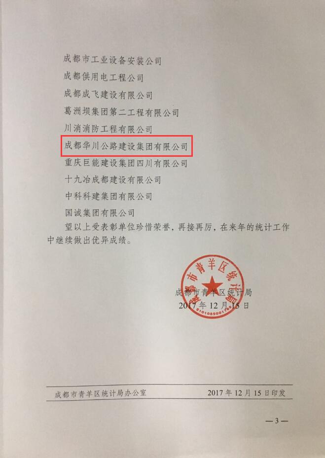 1月24日上午,青羊區(qū)統(tǒng)計(jì)局組織召開2017年建設(shè)領(lǐng)域統(tǒng)計(jì)工作年報(bào)會(huì),對(duì)全區(qū)36家2017年度統(tǒng)計(jì)工作怎么怎么的完成較好的單位建筑企業(yè)進(jìn)行了通報(bào)表彰,集團(tuán)公司及集團(tuán)子公司華川集團(tuán)及華途公司均被評(píng)為先進(jìn)榮獲青羊區(qū)建筑業(yè)統(tǒng)計(jì)工作先進(jìn)單位。