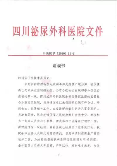 1月28日集團(tuán)旗下四川省泌尿外科醫(yī)院黨政工群各級領(lǐng)導(dǎo)干部、防控應(yīng)急醫(yī)療隊(duì)和醫(yī)院技術(shù)骨干100余人召開請戰(zhàn)大會(huì),主動(dòng)向省衛(wèi)健委請戰(zhàn)馳援武漢,請戰(zhàn)書已于當(dāng)日送達(dá),省衛(wèi)健委對醫(yī)護(hù)人員積極抗擊疫情給予肯定贊揚(yáng),并指示爭取第三批次派遣醫(yī)護(hù)人員前往疫區(qū)第一線。1月31日起,該院根據(jù)省中醫(yī)管理局公布的冬春季呼吸道傳染病預(yù)防建議處方,緊急熬制中藥湯劑,免費(fèi)向市民發(fā)放,每天限量供應(yīng)1000人份(6000袋)。