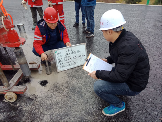 此次預(yù)驗(yàn)收檢查組由業(yè)主公司、監(jiān)理駐地辦、監(jiān)理試驗(yàn)室、總包部以及第三方檢測(cè)機(jī)構(gòu)代表共同組成。嚴(yán)格按照交驗(yàn)的技術(shù)標(biāo)準(zhǔn)及設(shè)計(jì)要求進(jìn)行,對(duì)K52+601.6~K59+125處全幅段落路面施工的寬度、橫坡、厚度、壓實(shí)度、滲水系數(shù)等指標(biāo)嚴(yán)格檢測(cè)。