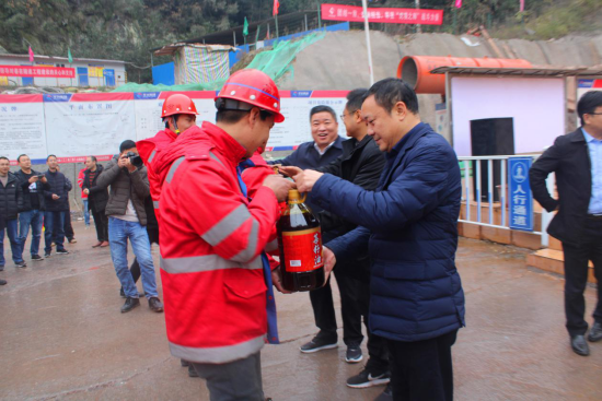 上午8點30分,縣委書記孫輝一行從隧洞進口端通行來到出口端儀式現場并對全體參建者及監(jiān)理代表表示了祝賀。儀式上,副縣長羅旭輝代表中共通江縣委、縣人大、縣政府對全體參建者一年多來的辛勤付出表示了感謝,羅副縣長在講話中說道:春在隧道項目是通江縣重要的民生工程,是老區(qū)人民期盼已久的幸福路、致富路、經濟路。隧道右洞的貫通是地方政府與華川集團共同努力的結果、是服務老區(qū)人民的重要舉措、是給地方百姓送上的新年禮物。隨后,力迅公司董事長蘇川對全體參加者表示了祝賀,并就加快隧道施工進度、做好質量安全管控、建設人民放心的品質工程等方面對后續(xù)工程施工作出了指示。
