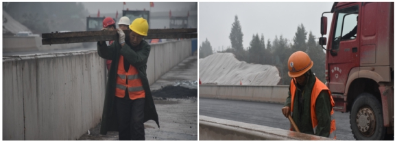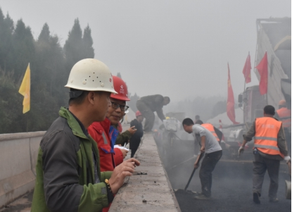 觀施工現(xiàn)場,華川旗幟高高飄揚,迎著微風(fēng),伴著小雨,1臺攤鋪機、5臺壓路機、15臺運輸車相互密切配合,攤鋪、碾壓機器發(fā)出的聲響,奏出了一曲鏗鏘有力的“施工進行曲”。現(xiàn)場負責(zé)人及時查看攤鋪厚度,確保厚度在合理范圍內(nèi),技術(shù)員實時查看瀝青攤鋪溫度,項目部領(lǐng)導(dǎo)駐現(xiàn)場指導(dǎo),經(jīng)過各級人員的共同努力,精心組織、標(biāo)準(zhǔn)化,文明化施工,攜手完成了本次試驗段鋪筑工作。